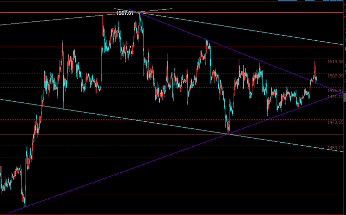 0 r" M6 Z E) I% T D: g. { 1、黄金在横盘了两周左右后,终于在以1400-1459-1473-1476-1480的趋势线连线节点继续支撑金价上行周末1517我们的短线目标,下方也按分析完成了以1459为低点的不是太规则的头肩底底部形态,虽说横盘够久,但是最终这个形态还算勉强成立了,周五虽说仅到我们的短线目标就在前期平行高点继续压制回撤1500,不过趋势上我们后期依旧做多看待,回落4小时MA60-1499至1500关口的支撑下,也是前面1557-1535-1517趋势线上轨上破后回落再1500左右的反支撑,需要继续在其左右及临近上方做多介入,继续看1417平行压制的上破,上破后继续测试如图我们规划的趋势通道上轨在1532-35范围的目标,同时此趋势线随时间窗口也是前期1535回撤高点压制,我们的多单还是需要继续看此位置的测试或者上破。